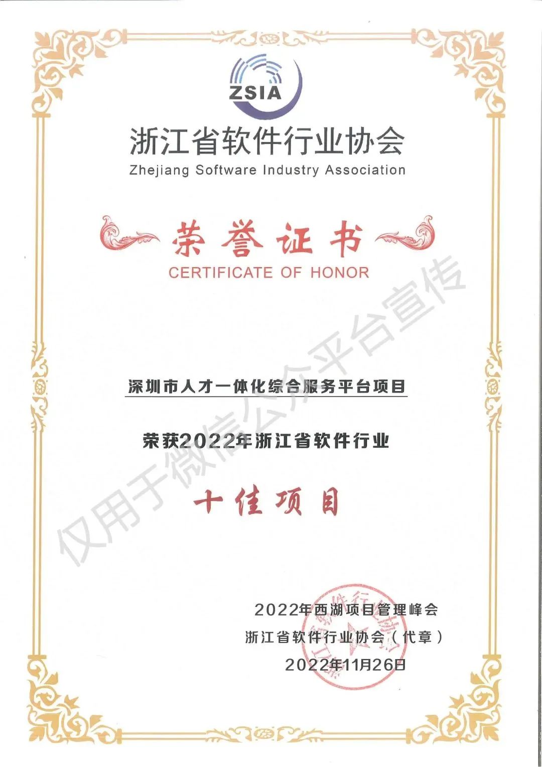 优秀!深圳市人才一体化综合服务平台项目获评2022年浙江省软件行业十佳项目